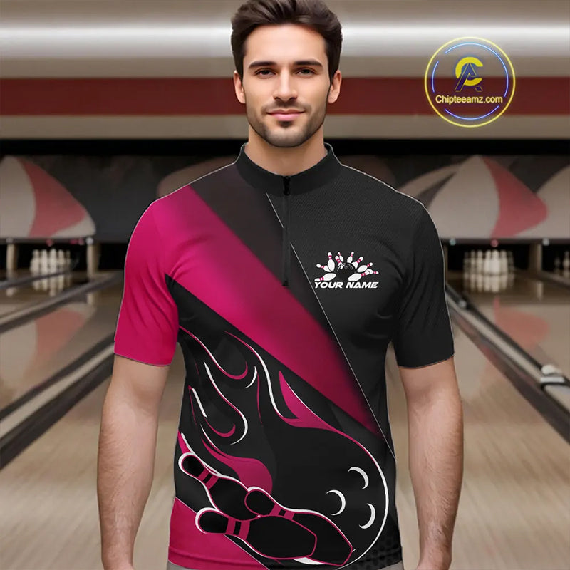Custom Black And Pink Flame Bowling Men Quarter-Zip Shirt, Team Bowling League Shirt IPHW10256