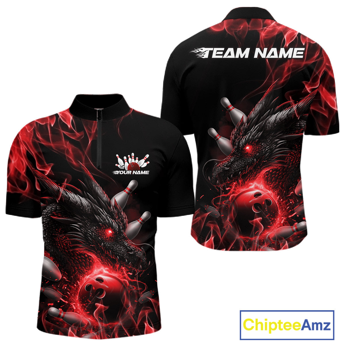 Custom Black And Red Flame Dragon Bowling Men Quarter-Zip Shirt, Dragon Bowling League Shirt IPHW10272