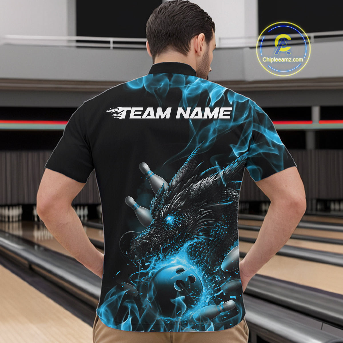 Custom Black And Blue Flame Dragon Bowling Men Quarter-Zip Shirt, Dragon Bowling League Shirt IPHW10273
