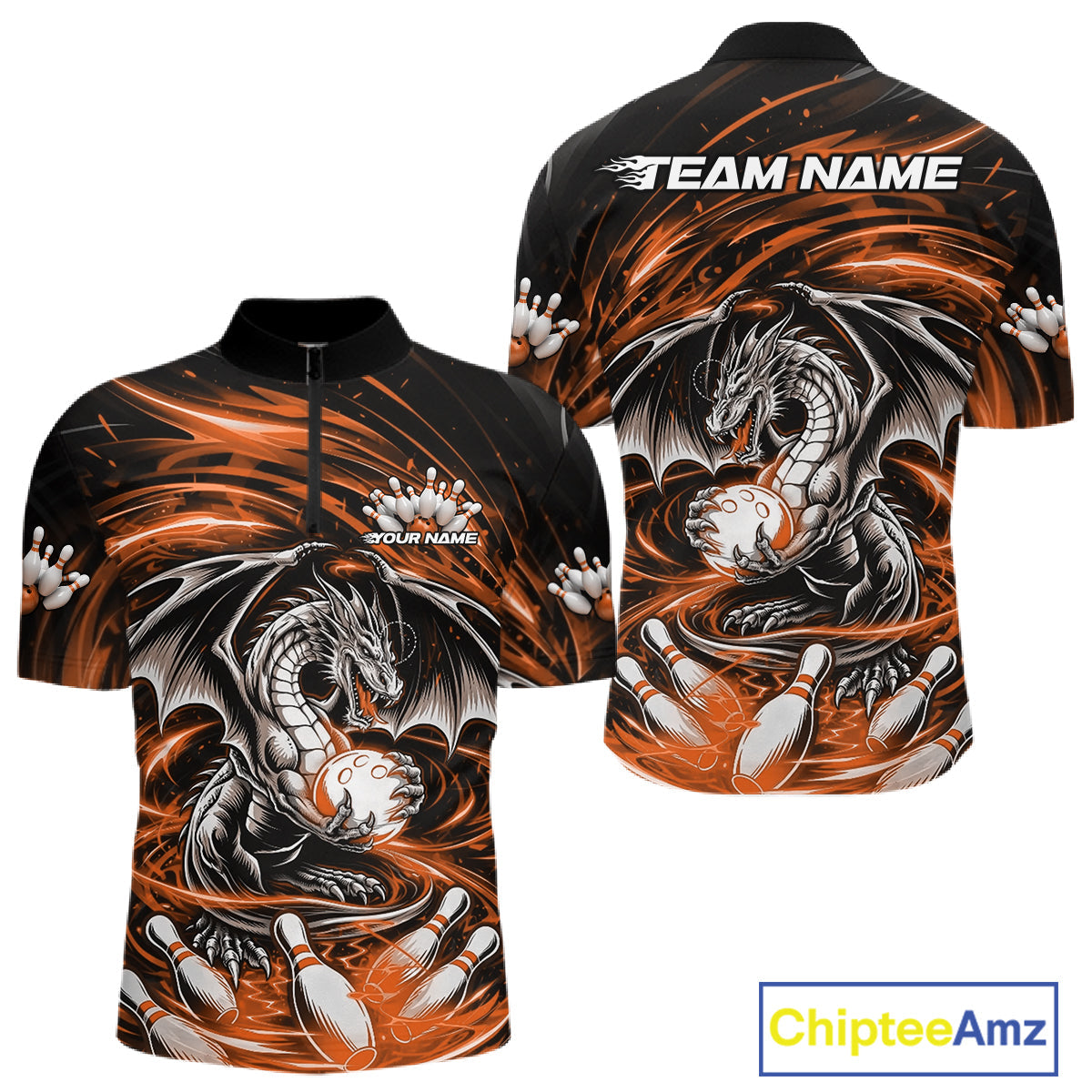 Custom Black And Orange Fire Flame Dragon Bowling Jerseys Bowling Team Men Quarter-Zip Shirt IPHW10293