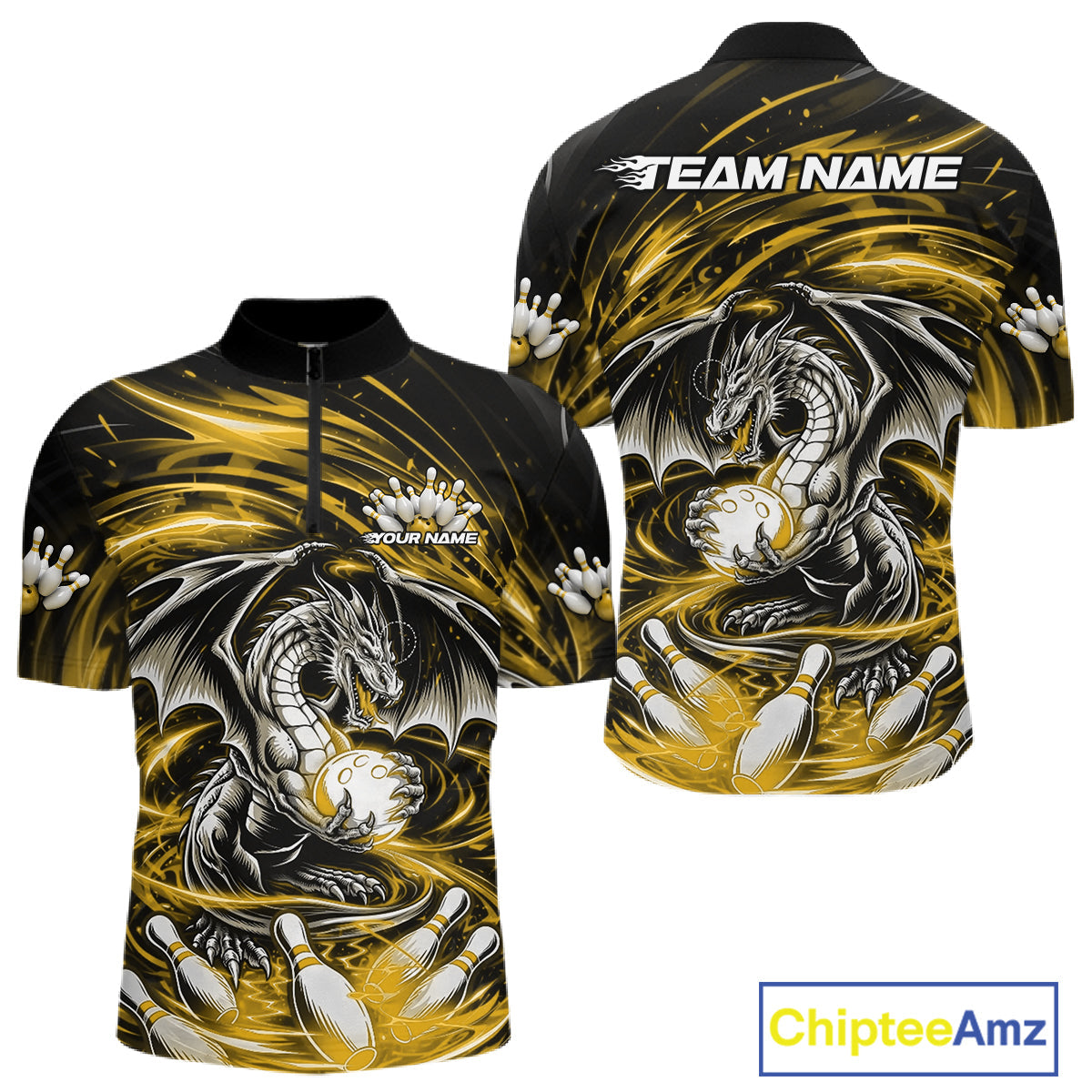 Custom Black And Yellow Fire Flame Dragon Bowling Jerseys Bowling Team Men Quarter-Zip Shirt IPHW10294