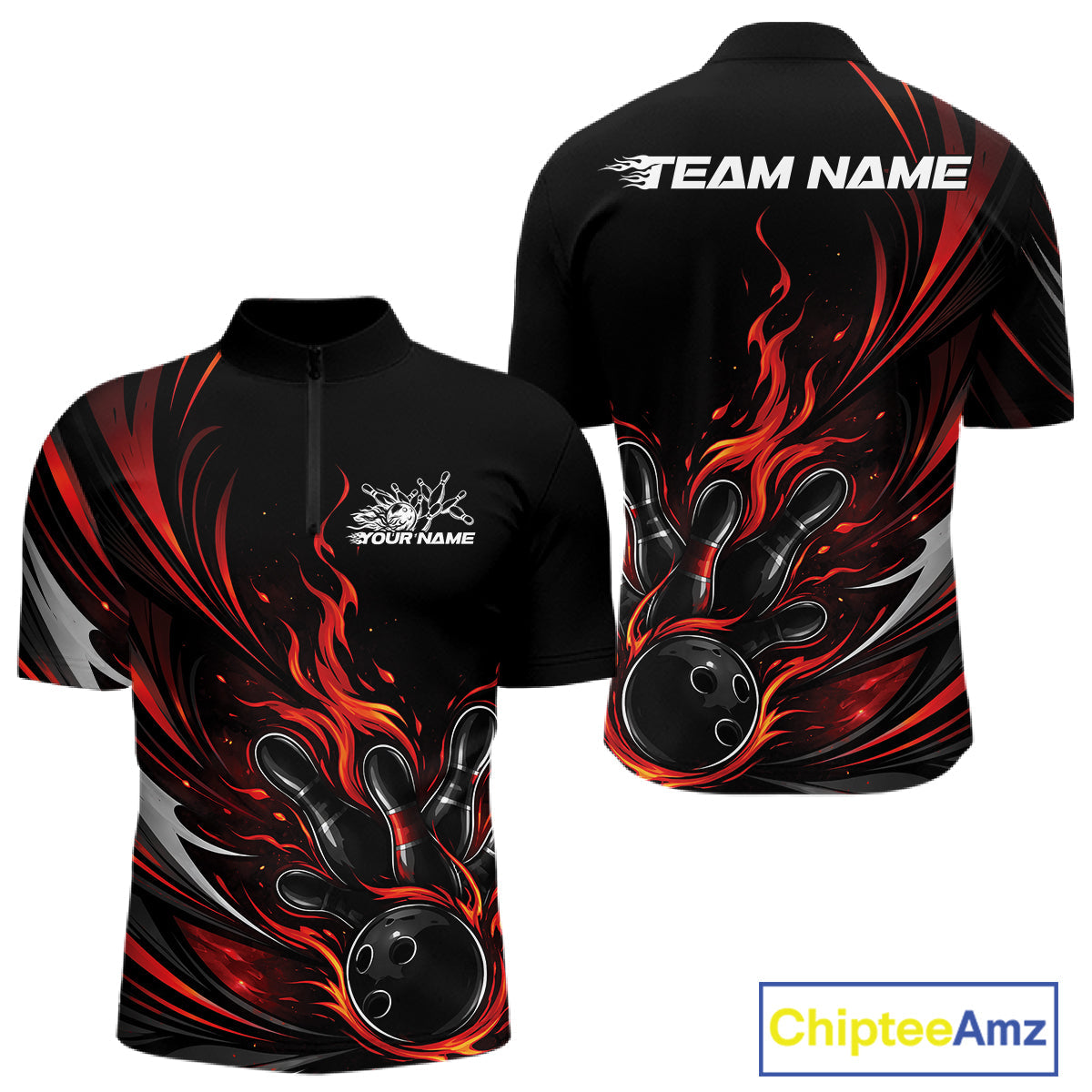 Custom Black And Red Fire Flame Bowling Men Jerseys, Bowling League Quarter-Zip Shirt IPHW10308