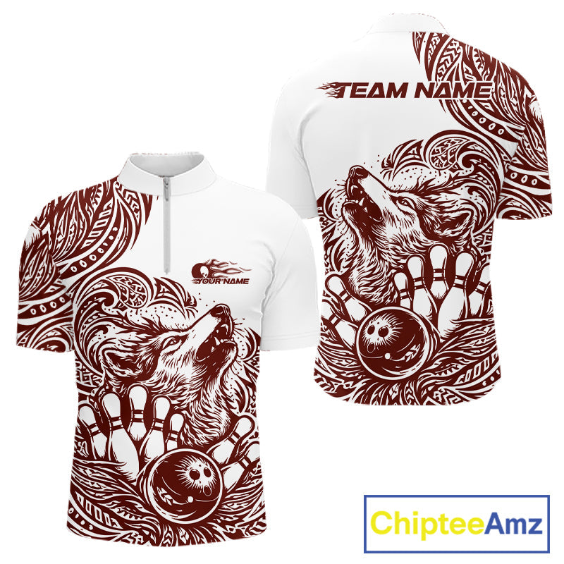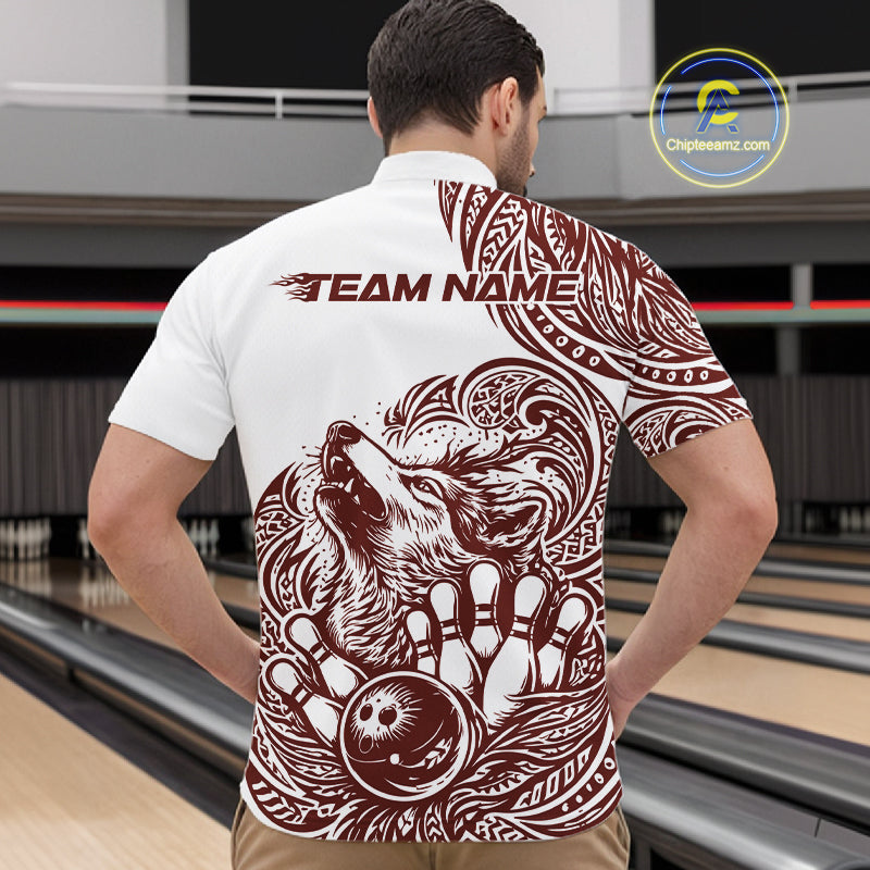 Custom Burgundy Tribal Pattern Maori Style Wolf Bowling Team Men Quarter-Zip Shirts IPHW10332