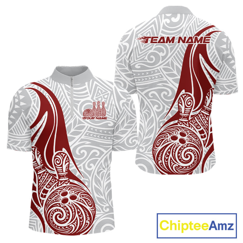 Custom Red Polynesian Tribal Bowling Men Quarter-Zip Shirt, Maori Style Bowling Shirt IPHW10337