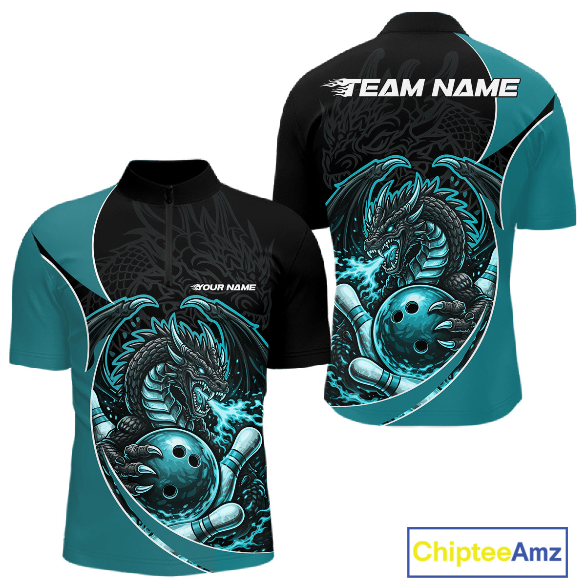 Custom Turquoise Blue Fire Dragon Bowling Jerseys, Dragon Bowling Team Men Quarter-Zip Shirt IPHW10366