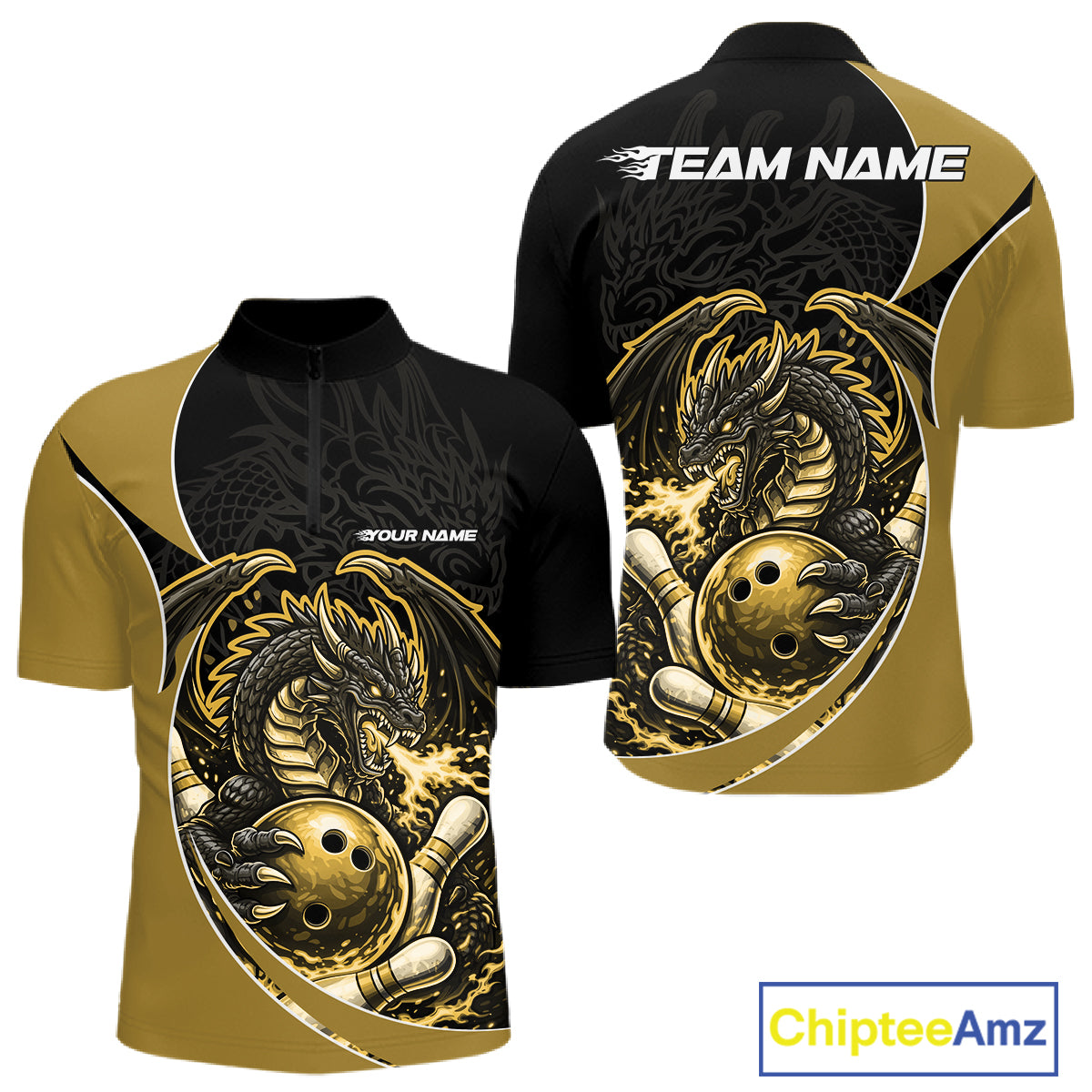 Custom Yellow Fire Dragon Bowling Jerseys, Dragon Bowling Team Men Quarter-Zip Shirt IPHW10367