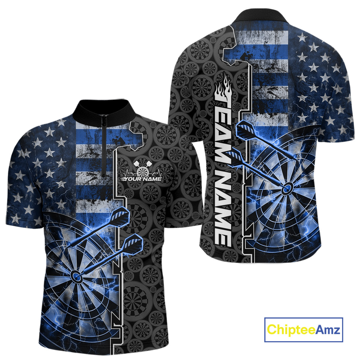 Custom Blue Lightning US Flag Dartboard Patriotic Dart Team Men Quarter-Zip Shirt Dart Jerseys IPHW10388