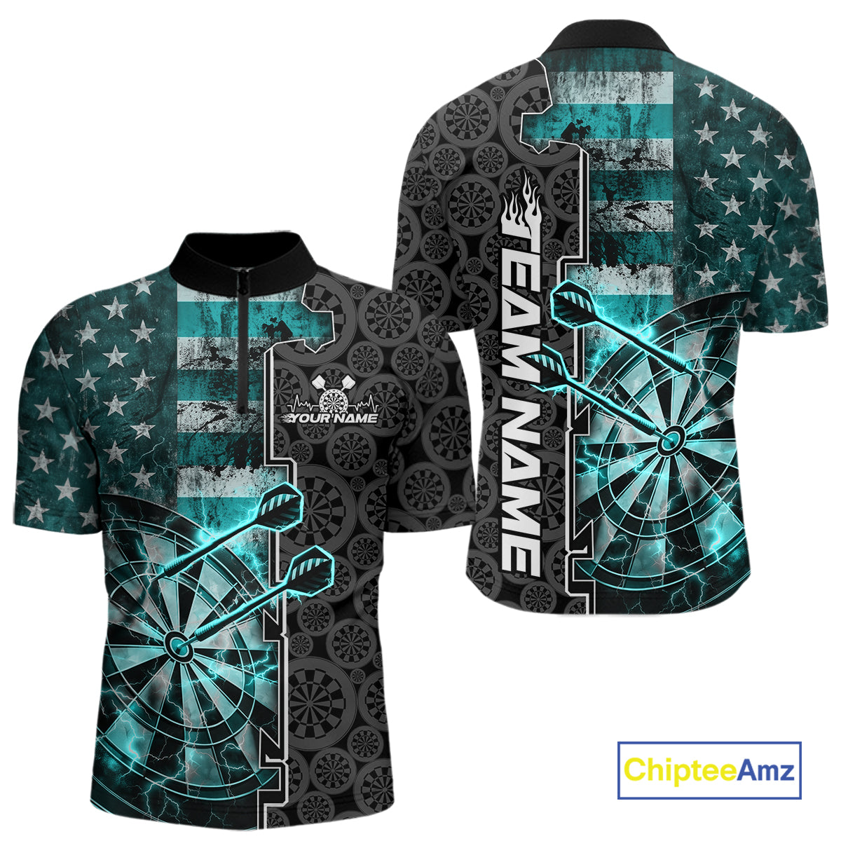Custom Turquoise Blue Lightning US Flag Dartboard Patriotic Dart Team Men Quarter-Zip Shirt IPHW10391