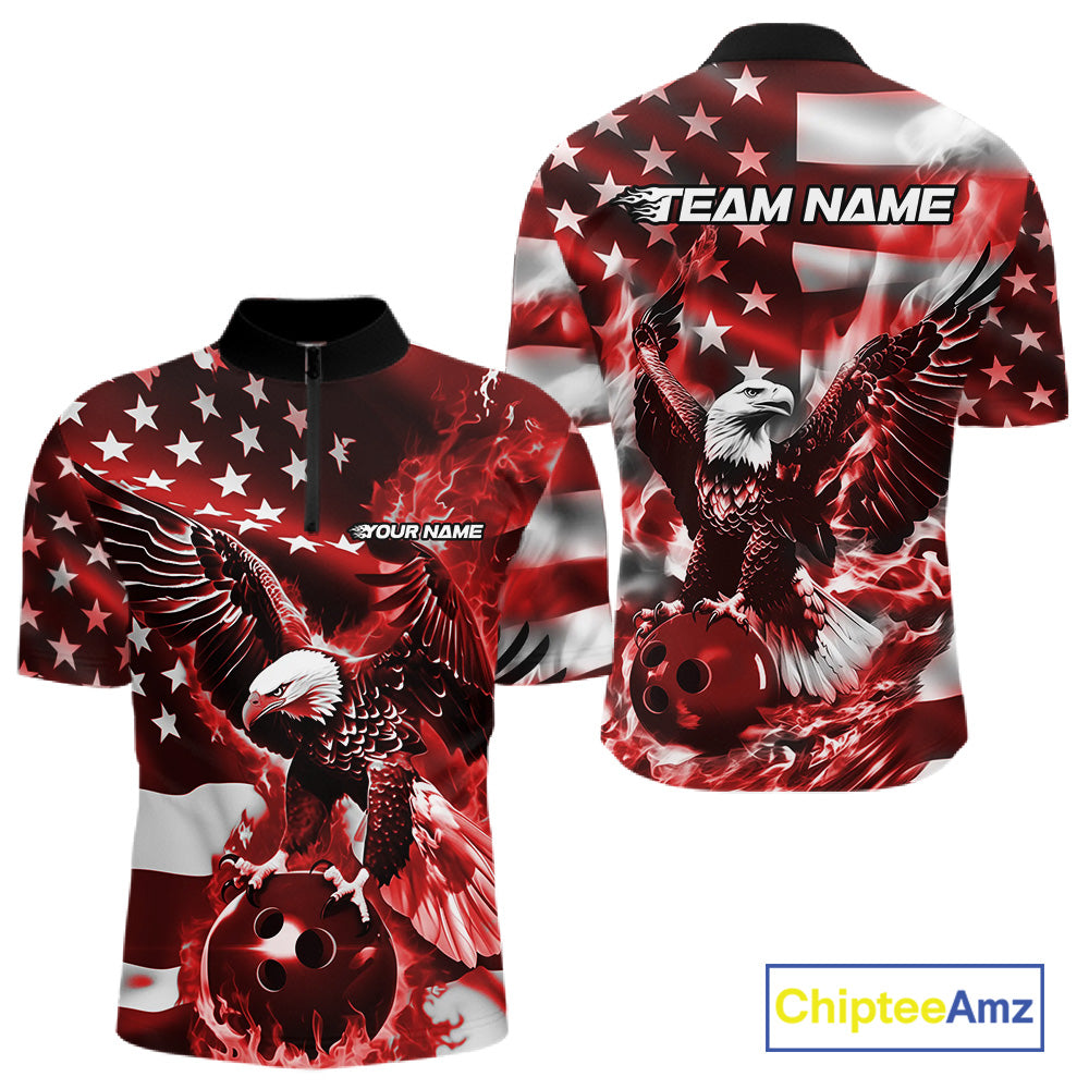 Custom Red Flaming American Flag Eagle Bowling Team Men Shirt, Patriotic Bowlers Outfit IPHW10779
