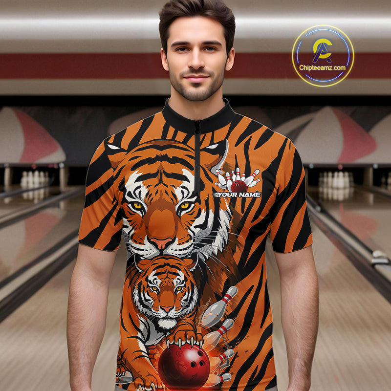 Custom Tiger Print Bowling Team Shirts, Tiger Men Quarter-Zip Shirts With Name IPHW9095