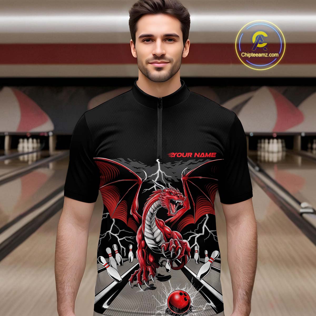 Custom Red Dragon On The Lane Bowling Quarter-Zip Shirts For Men, Dragon Bowling Team Shirt IPHW9101