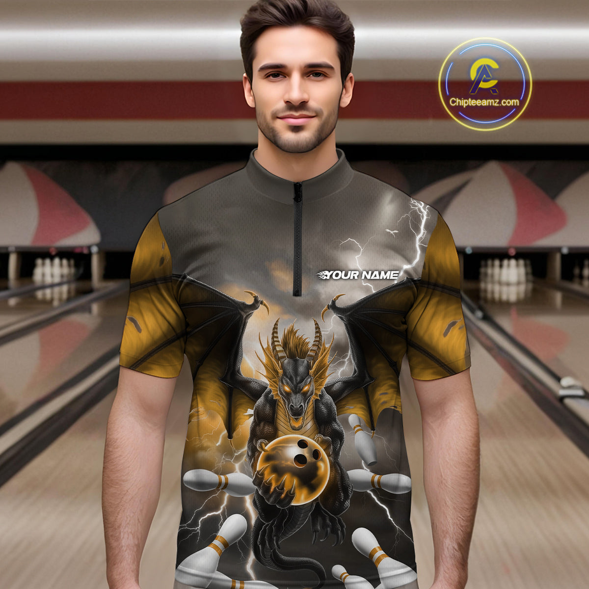 Custom Yellow Thunder Lightning Dragon Bowling Quarter-Zip Shirts For Men, Team Uniform IPHW9105
