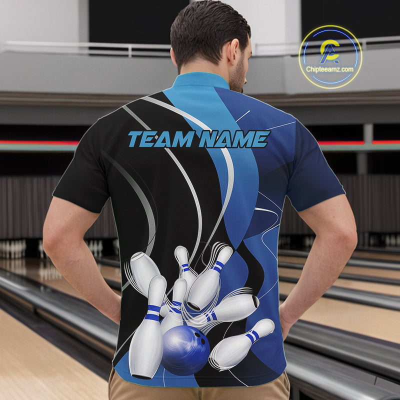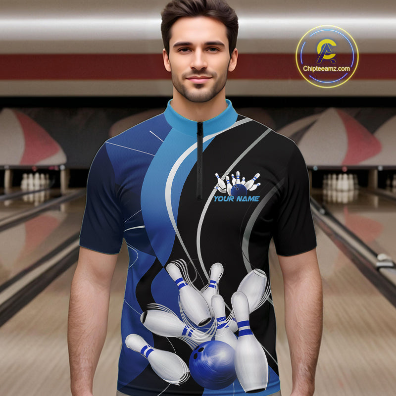 Custom Black And Blue Bowling Jerseys, Men Bowling Quarter-Zip Shirt Team Uniform IPHW9226