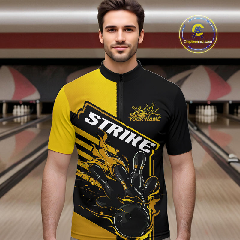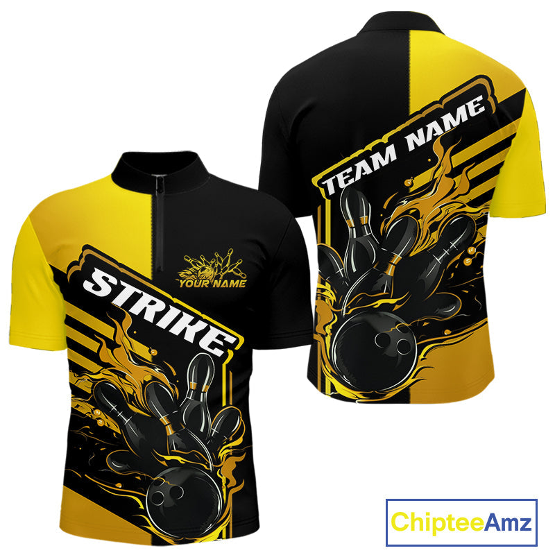 Custom Black And Gold Flame Strike Bowling Quarter-Zip Shirts For Men, Fire Bowling League Shirt IPHW9270