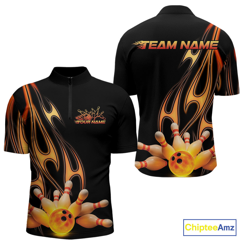 Custom Flame Bowling Team Quarter-Zip Shirts For Men, Bowling Tournament Team Outfit IPHW9287