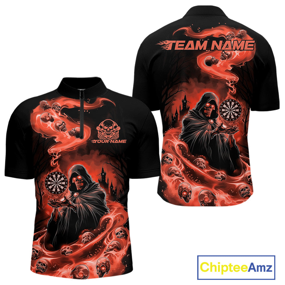 Custom Orange Flame Grim Reaper Dart Men Quarter-Zip Shirts, Dart Team Halloween Outfits IPHW9982