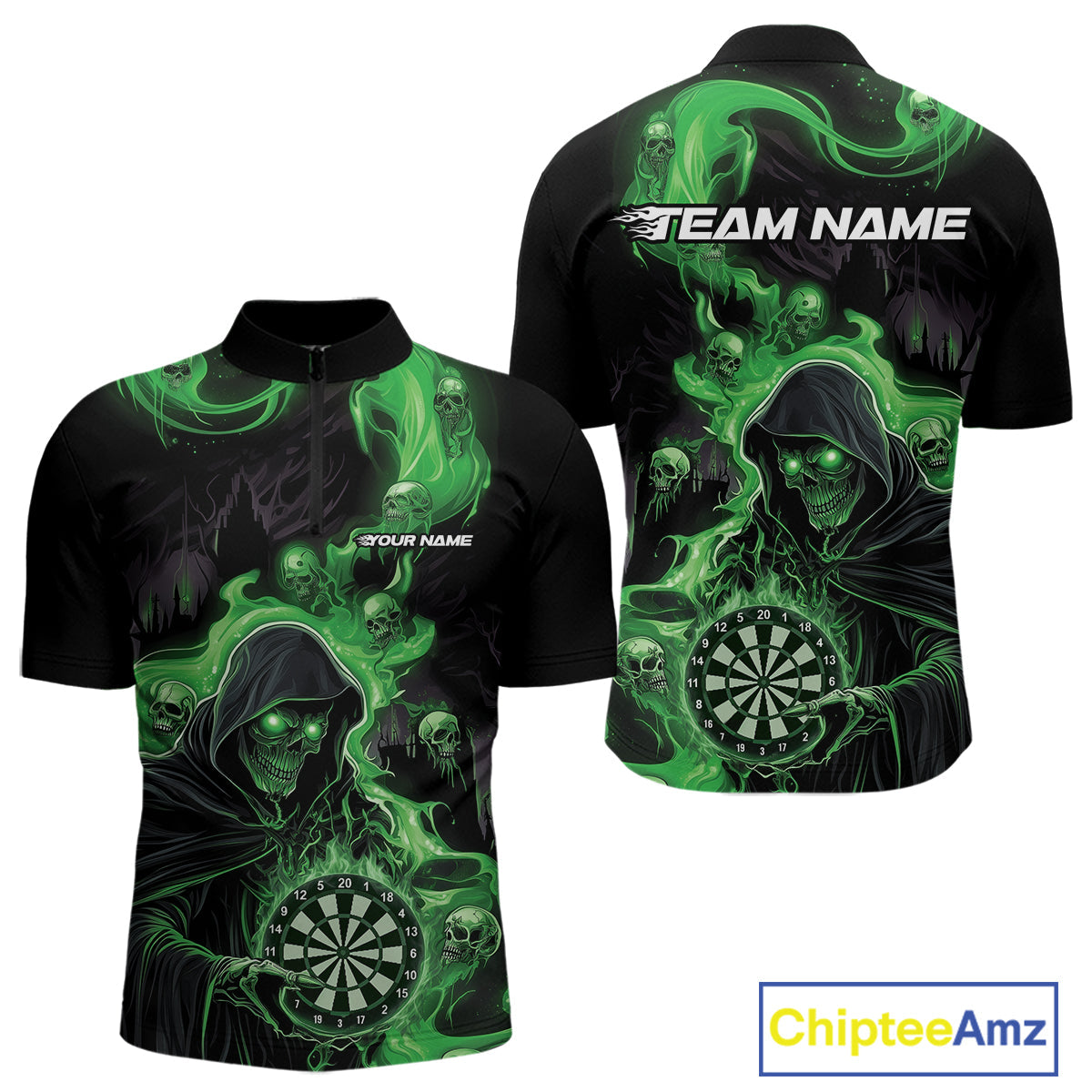 Custom Green Fire Flame Grim Reaper Dart Men Quarter-Zip Shirts, Dart Team Halloween Outfits IPHW9983