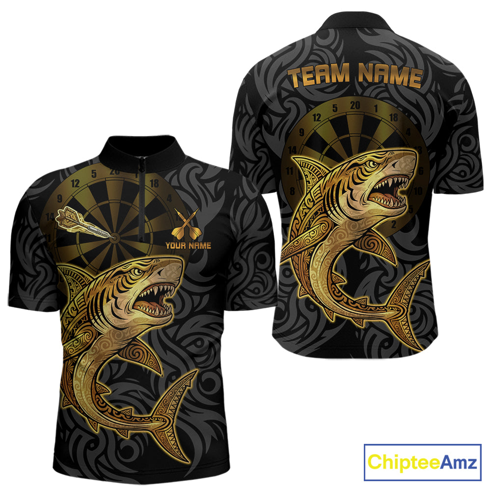 Personalized Black & Gold Funny Shark Tribal Dart Quarter-Zip Shirts Men Dart Team Jerseys NYN2186