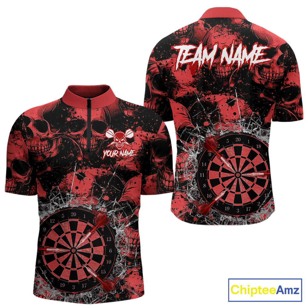 Red Grunge Skull Cracked Glass Dartboard Custom Men Darts Quarter-Zip Shirts Dart Team Jerseys NYN2259