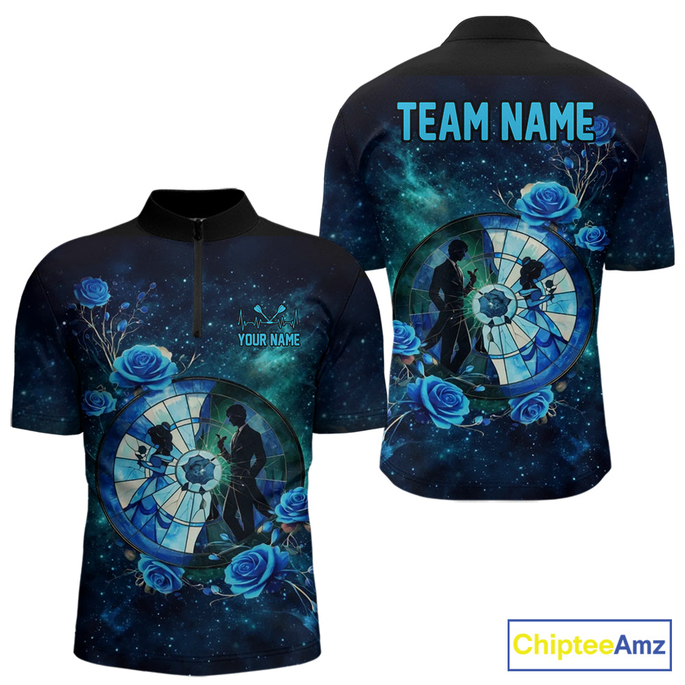 Blue Galaxy Roses Groom & Bride Dartboard Men Darts Quarter-zip Shirt Custom Valentine Dart Couple Gifts NYN2516