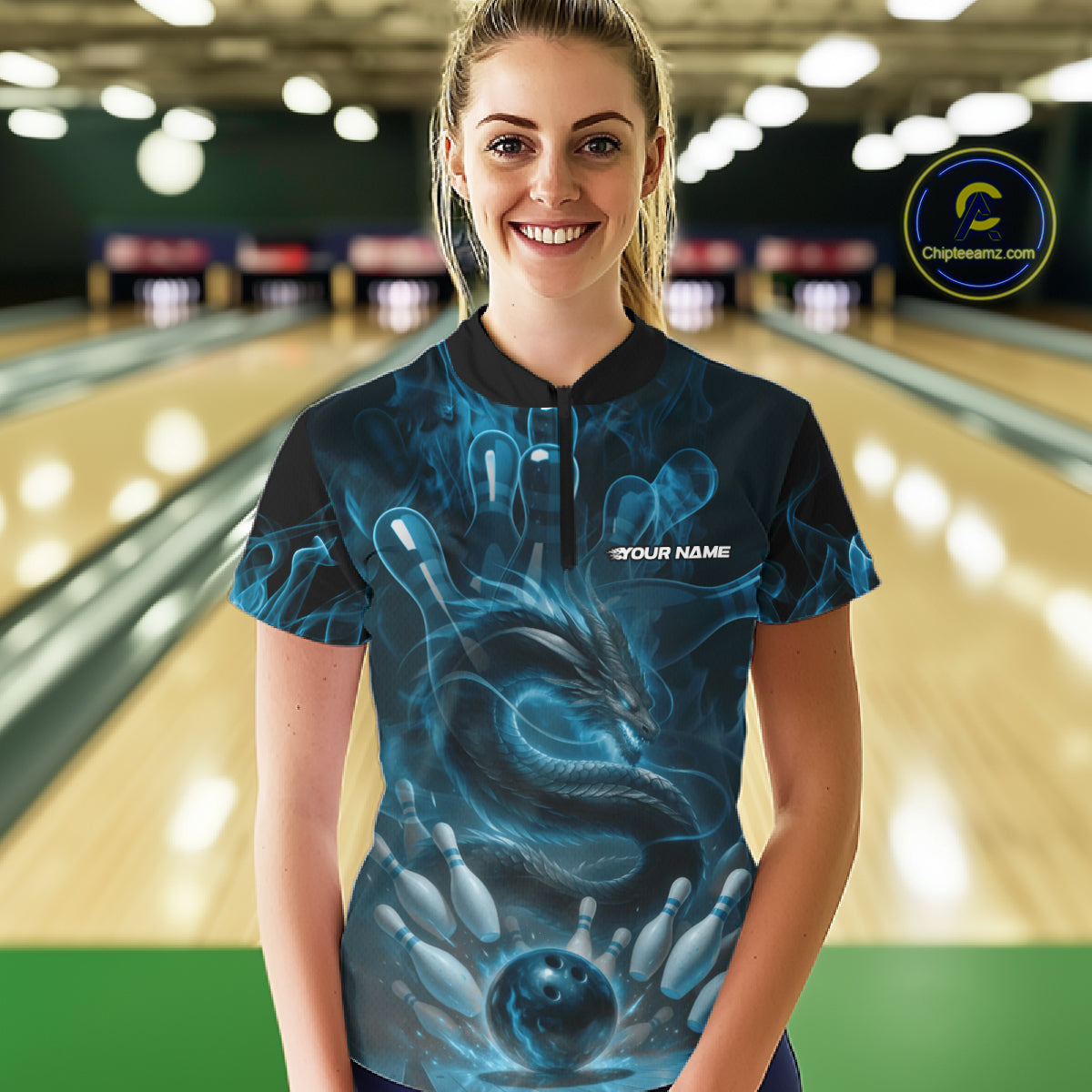 Custom Blue Flame Dragon Bowling Women Quarter-Zip Shirts, Dragon Bowling League Shirt IPHW10224