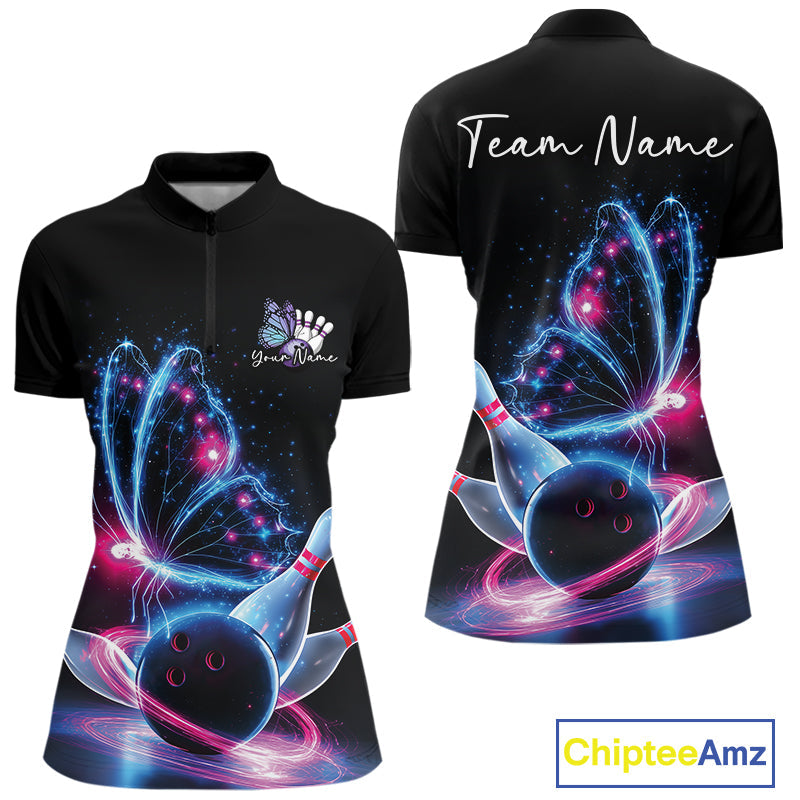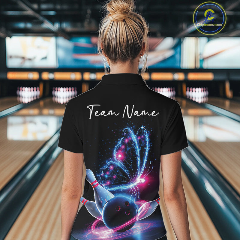 Custom Blue And Pink Galaxy Butterfly Bowling Women Shirts, Ladies Bowling Outfit IPHW10243