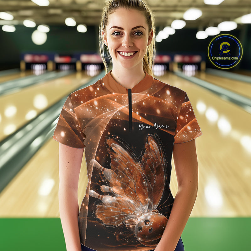 Custom Ethereal Orange Butterfly Bowling Women Quarter-Zip Shirts, Ladies Bowling Outfit IPHW10247