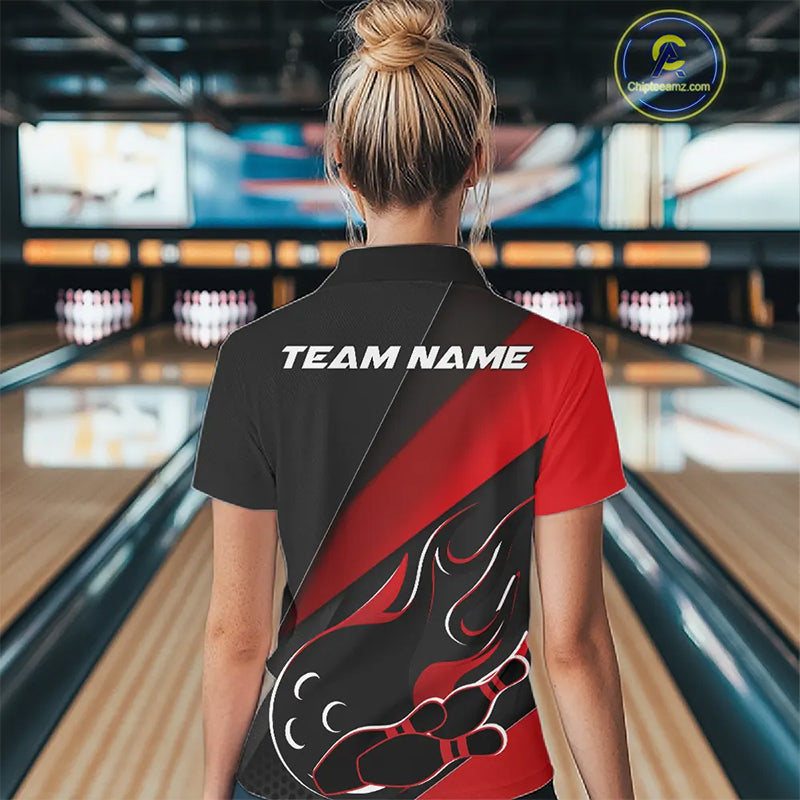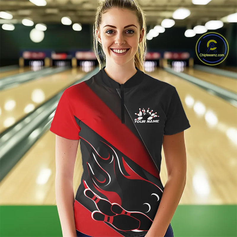 Custom Black And Red Flame Bowling Women Quarter-Zip Shirt, Team Bowling League Shirt IPHW10254