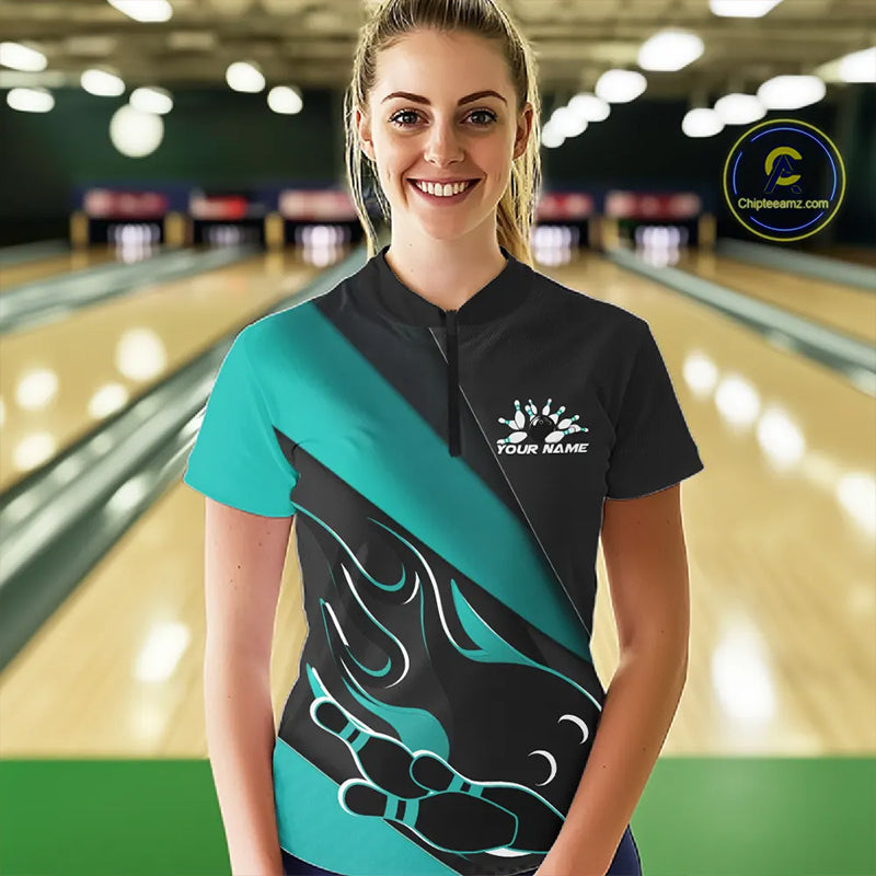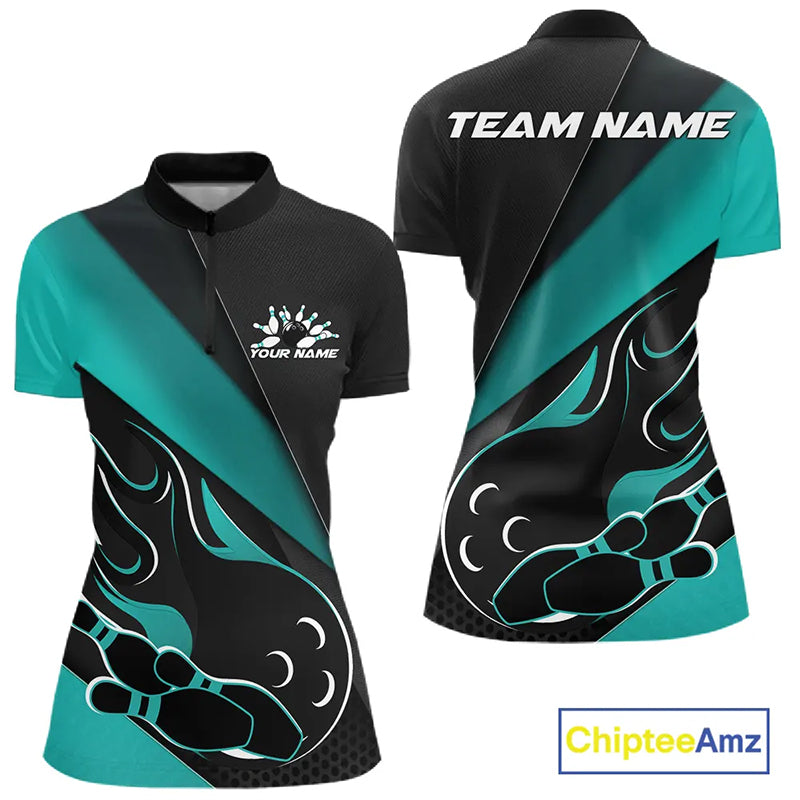 Custom Black And Turquoise Blue Flame Bowling Women Shirt, Team Bowling League Shirt IPHW10255