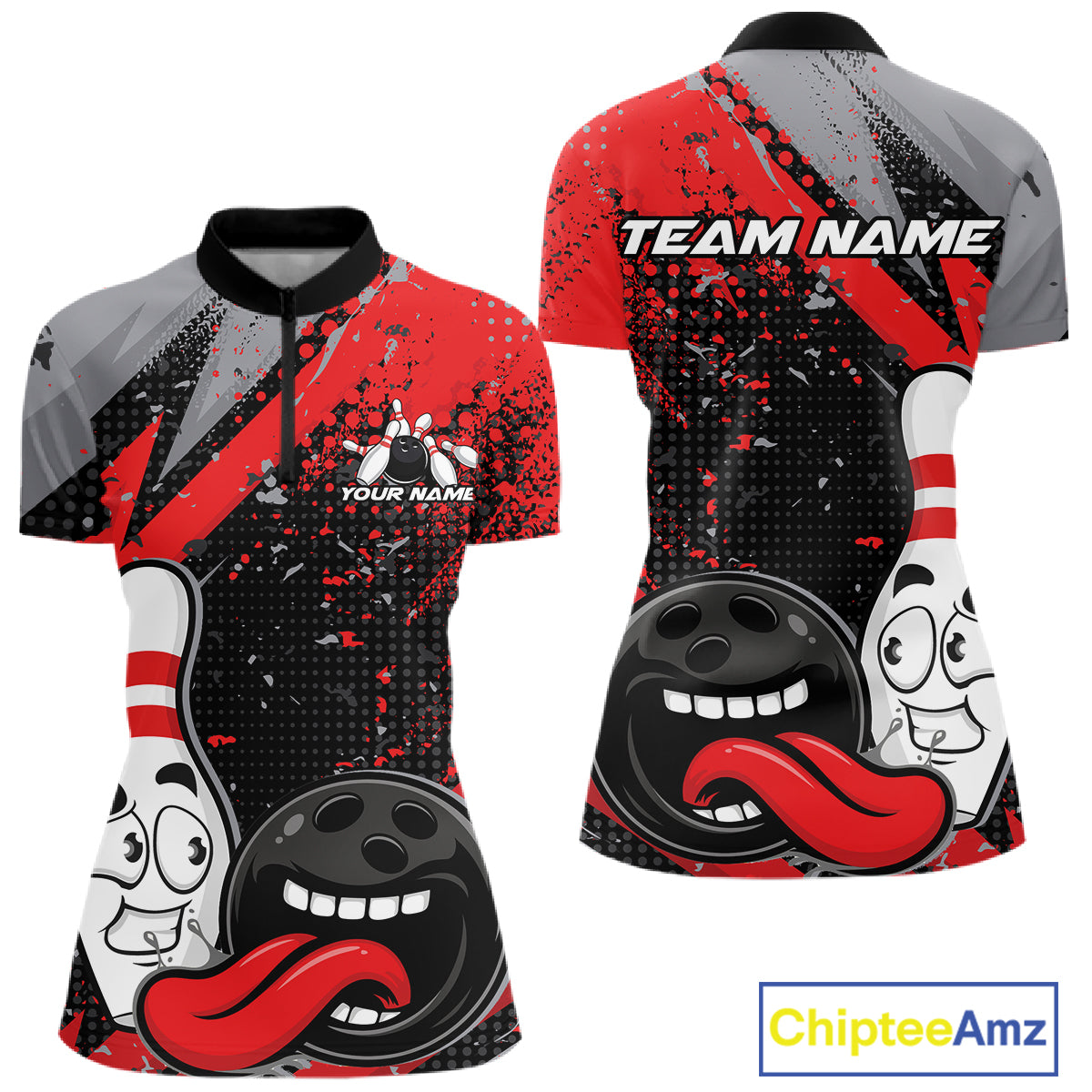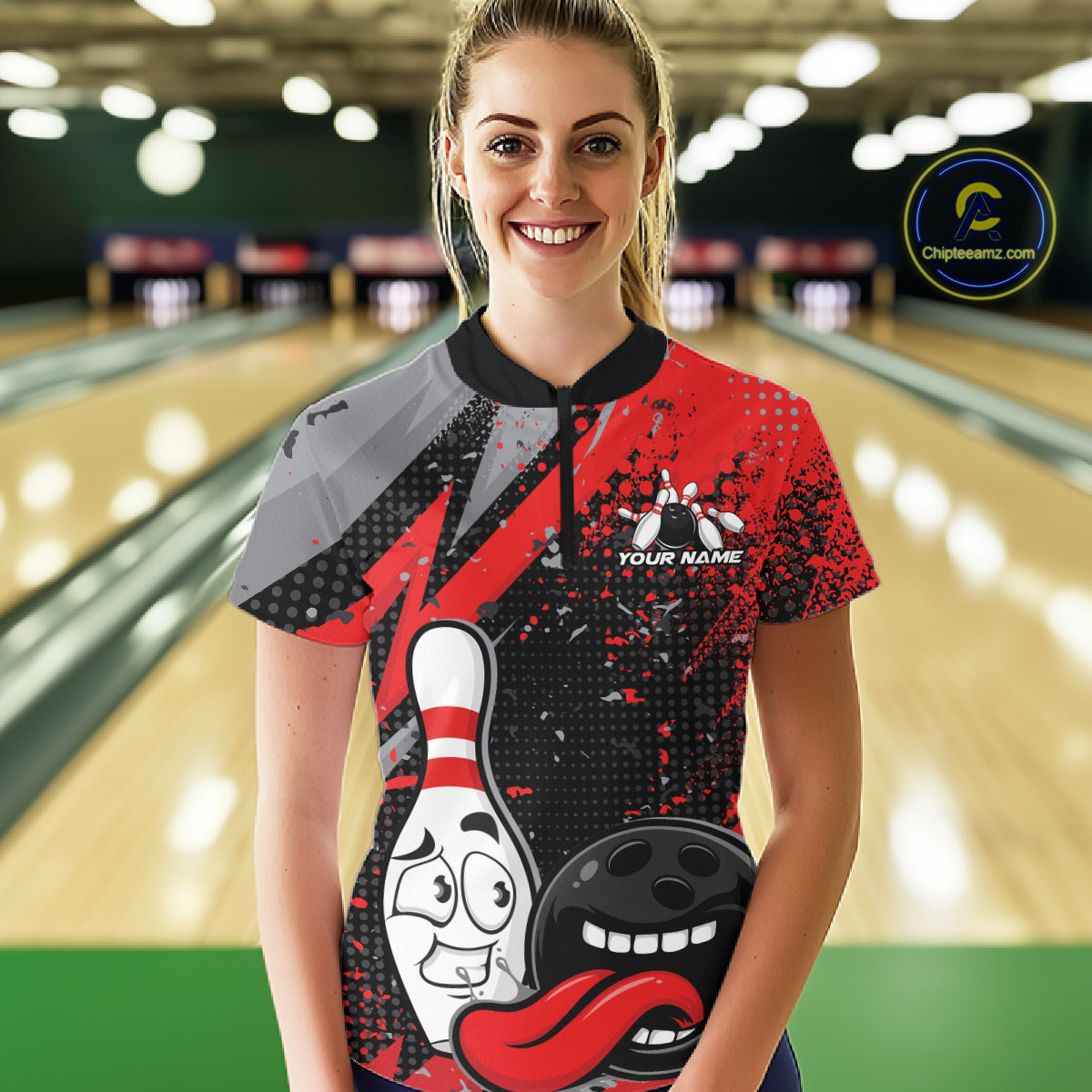 Custom Funny Bowling Women Quarter-Zip Shirt, Red Bowling Ball And Pin Bowling Jersey IPHW10257
