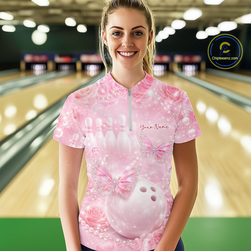 Custom Elegant Roses And Butterfly Women Bowling Quarter-Zip Shirt, Ladies Bowling Shirt IPHW10312
