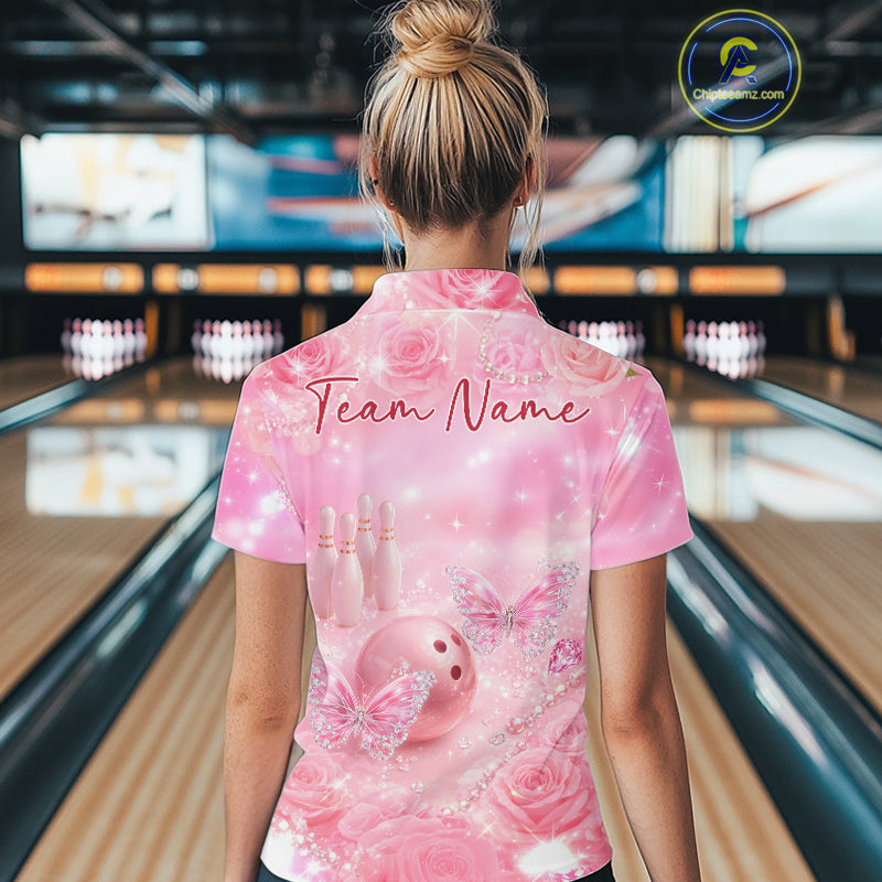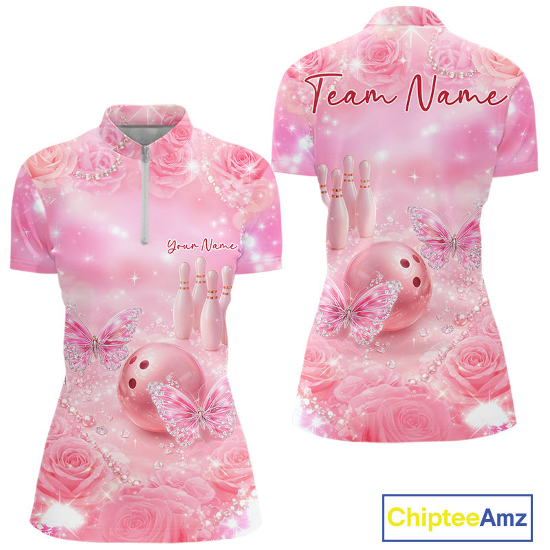 Custom Elegant Roses And Butterfly Women Bowling Quarter-Zip Shirt, Ladies Bowling Shirt IPHW10315