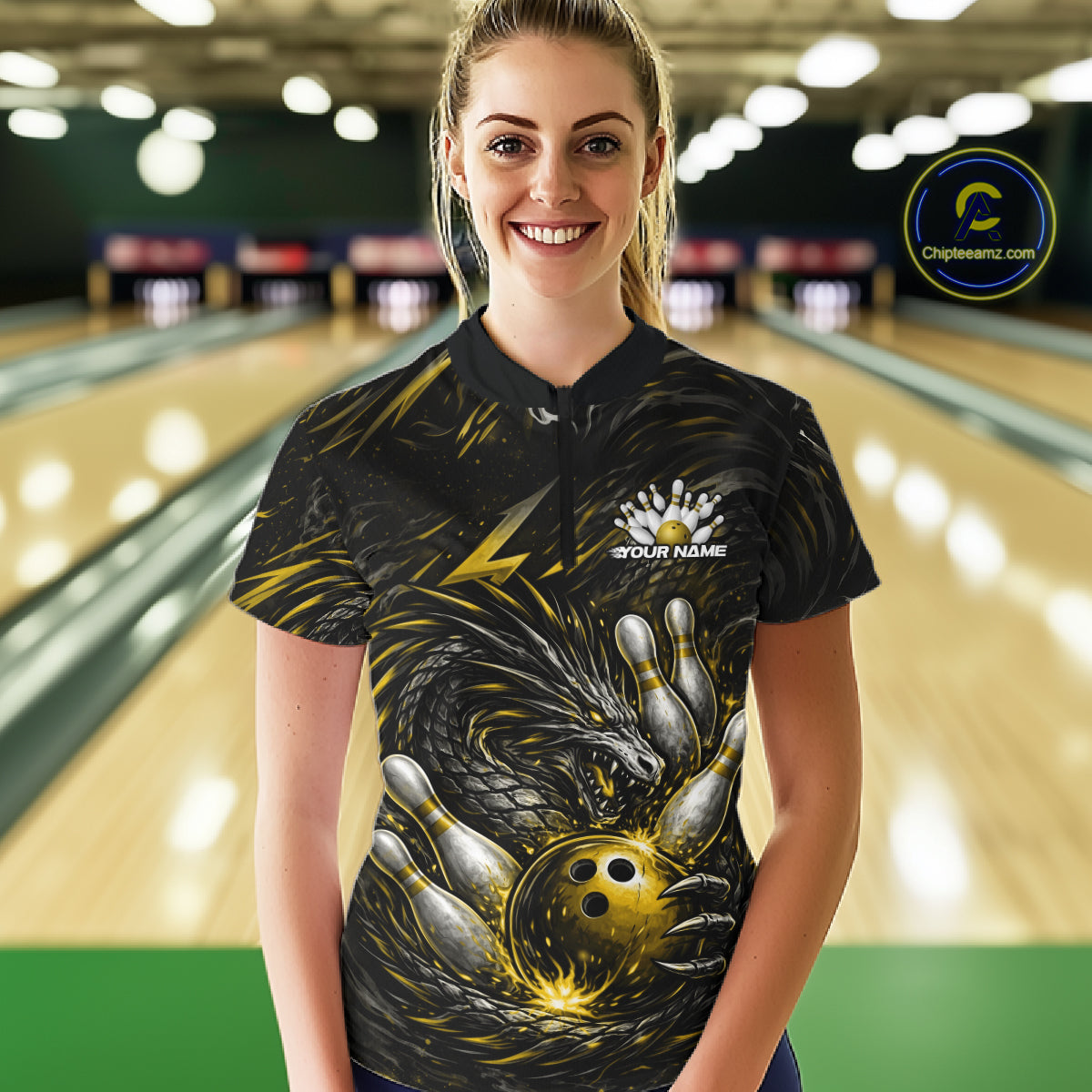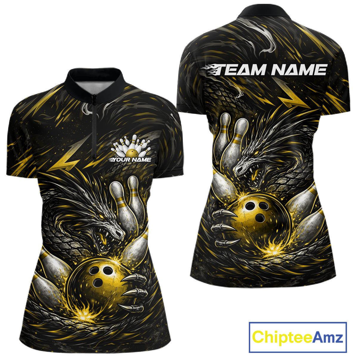 Custom Black And Gold Dragon Bowling Jersey, Dragon Bowling Team Women Quarter-Zip Shirt IPHW10364