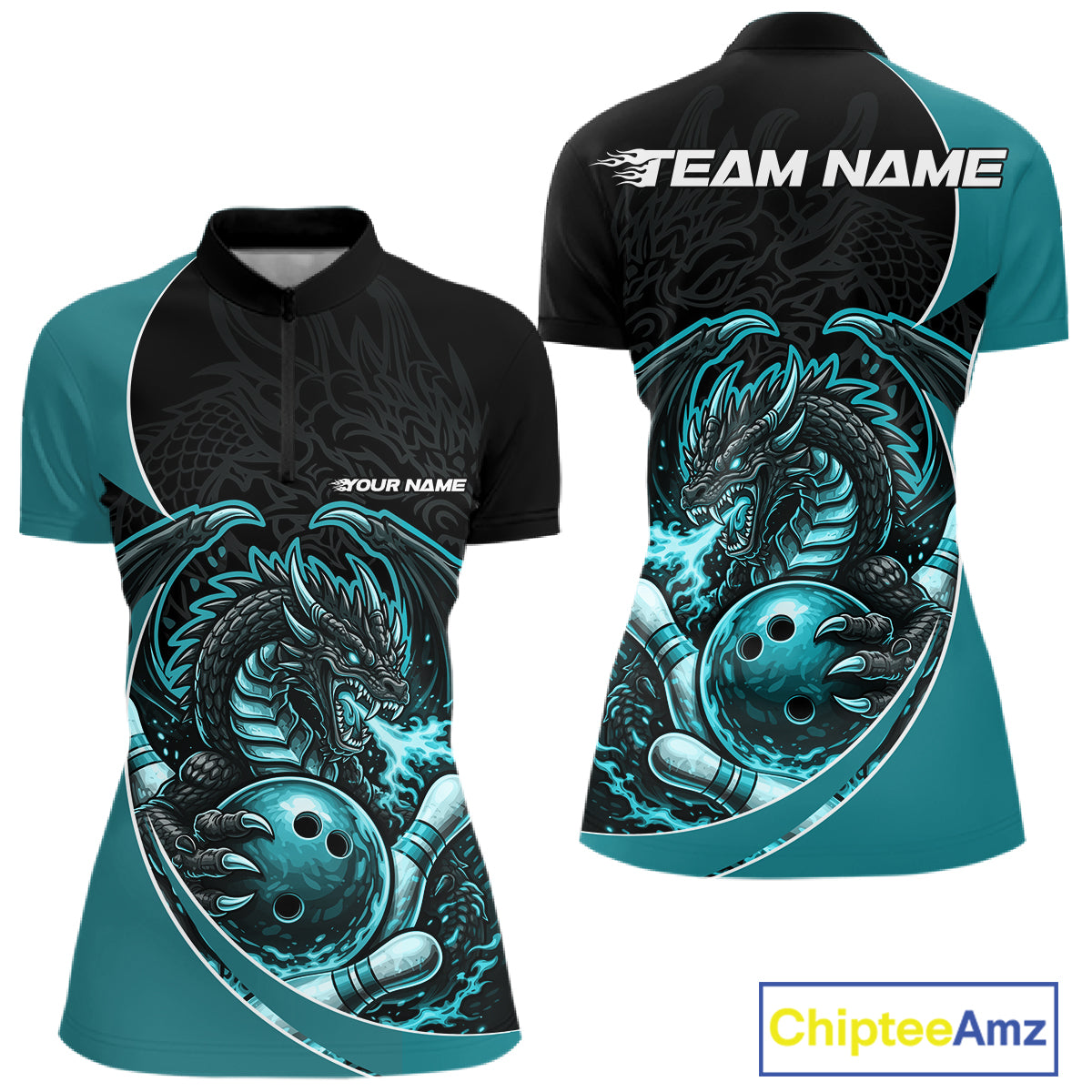 Custom Turquoise Blue Fire Dragon Bowling Jerseys, Bowling Team Women Quarter-Zip Shirt IPHW10366