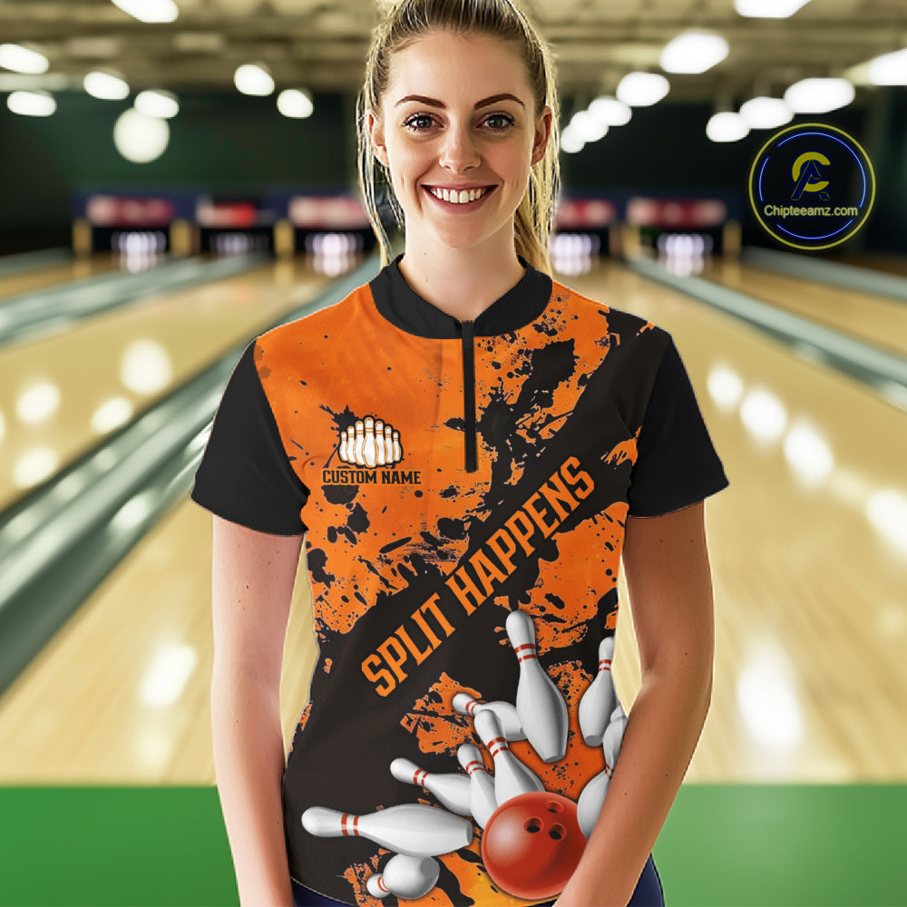 Split Happens Funny Orange Strike Bowling Women Quarter-Zip Shirts, Team Bowling Apparel IPHW6171