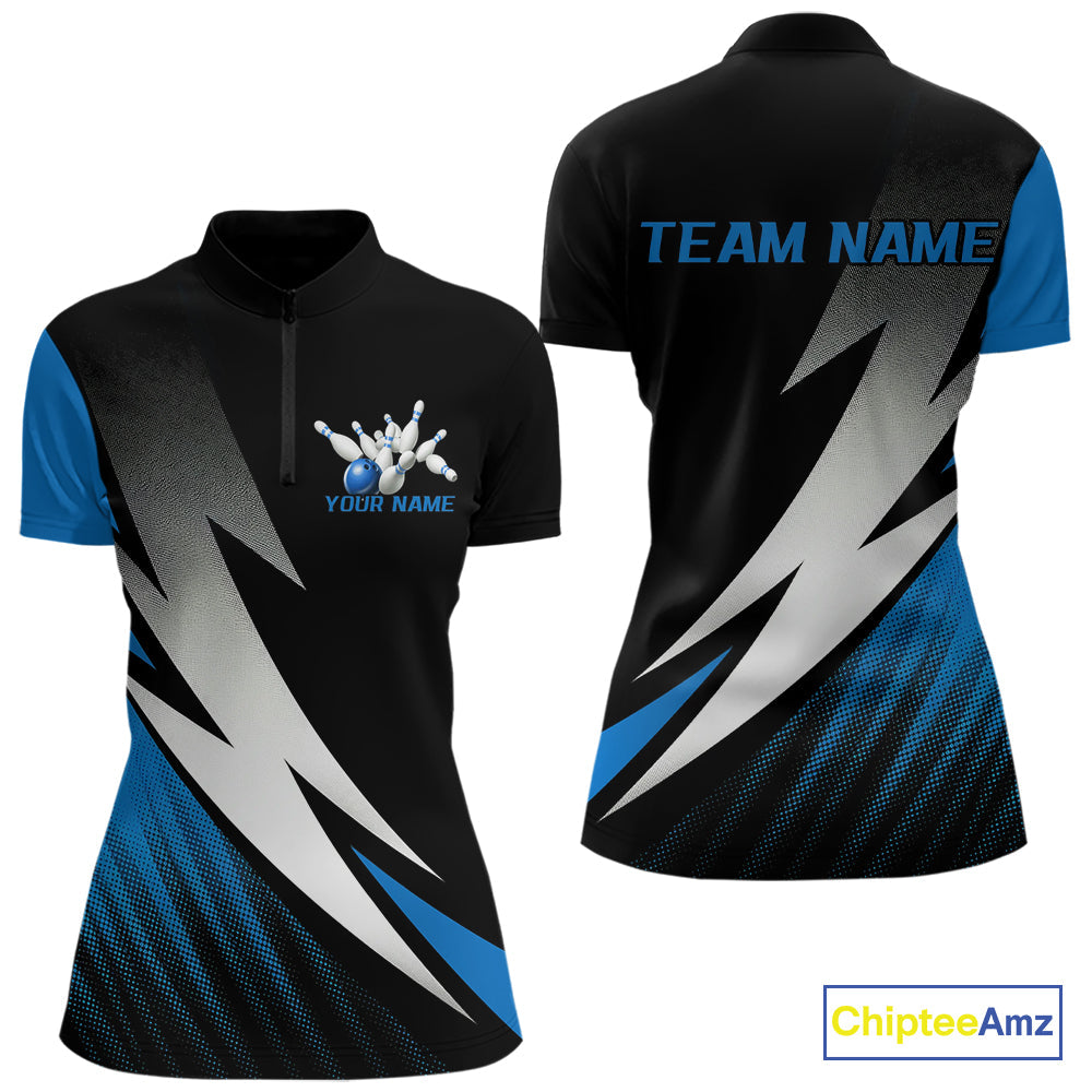 Black And Blue Custom Bowling Jerseys, Women Quarter-Zip Shirt Bowling Tournament Outfits IPHW9078