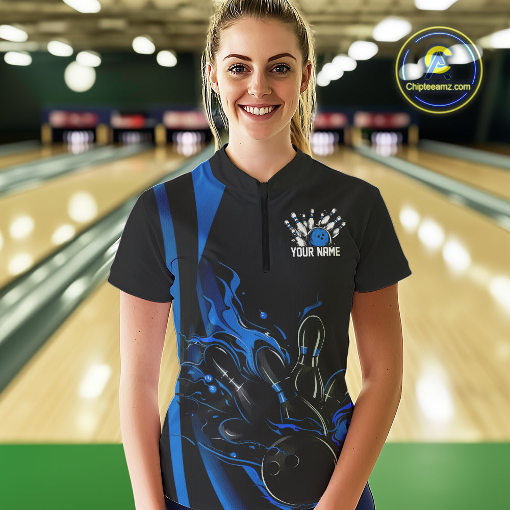 Custom Mid Blue Flame Bowling Women Quarter-Zip Shirt, Striking Fire Jerseys Team Uniform IPHW9084