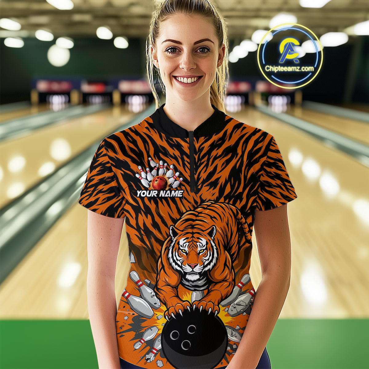 Custom Black And Orange Tiger Print Bowling Quarter-Zip Team Shirts For Women Jerseys IPHW9091
