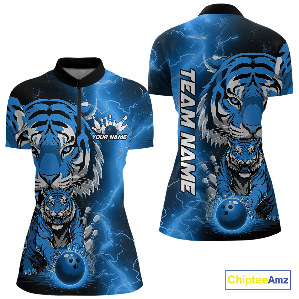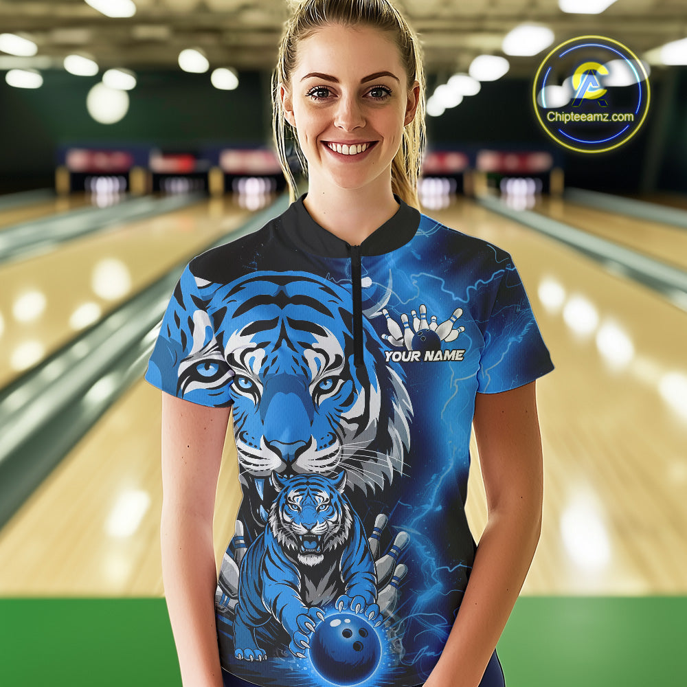 Custom Blue Thunder Lightning Tiger Bowling Quarter-Zip Shirts For Women, Team Outfit IPHW9094