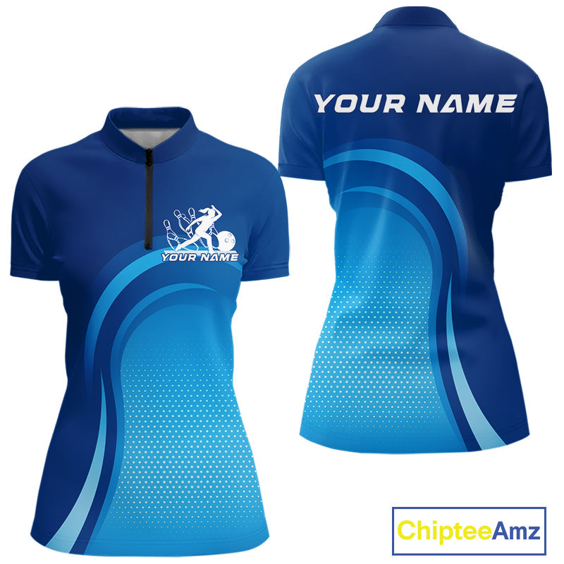 Custom Blue Bowling Team Women Quarter-Zip Shirt, Bowling Tournament Bowling League Shirt IPHW9236