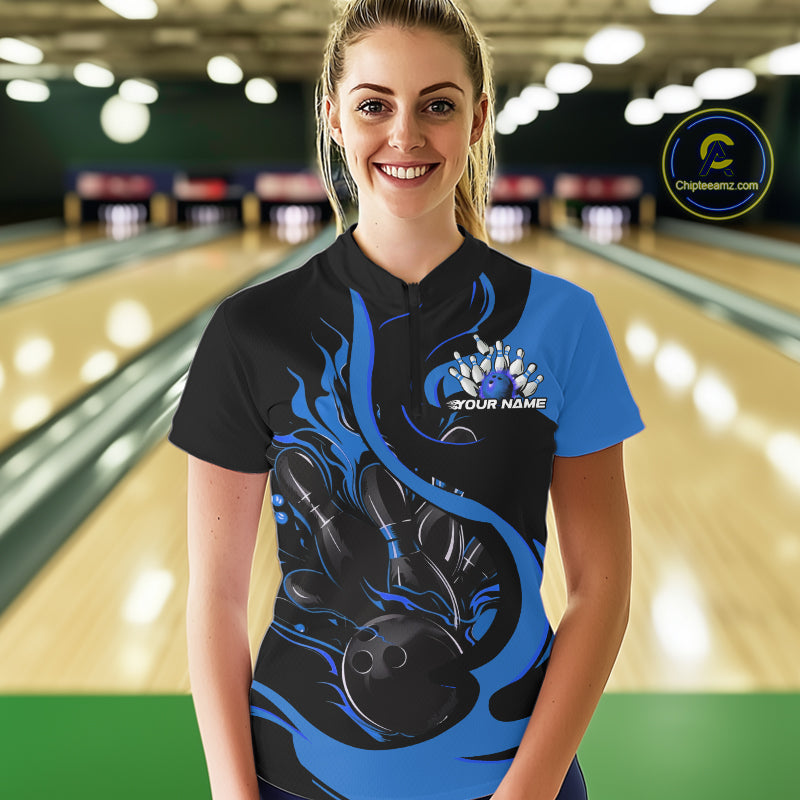 Custom Black And Blue Flame Bowling Women Quarter-Zip Shirt, Bowling Team Uniform IPHW9247