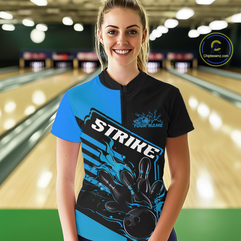 Custom Black And Blue Flame Strike Bowling Women Quarter-Zip Shirt, Bowling League Shirt IPHW9268