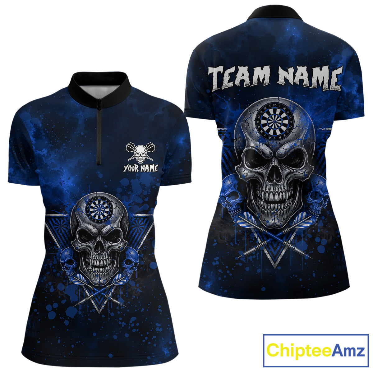 Custom Blue Splatter Multi-Skull Women Darts Arrow Quarter-Zip League Shirts Dart Team Jerseys NYN2201