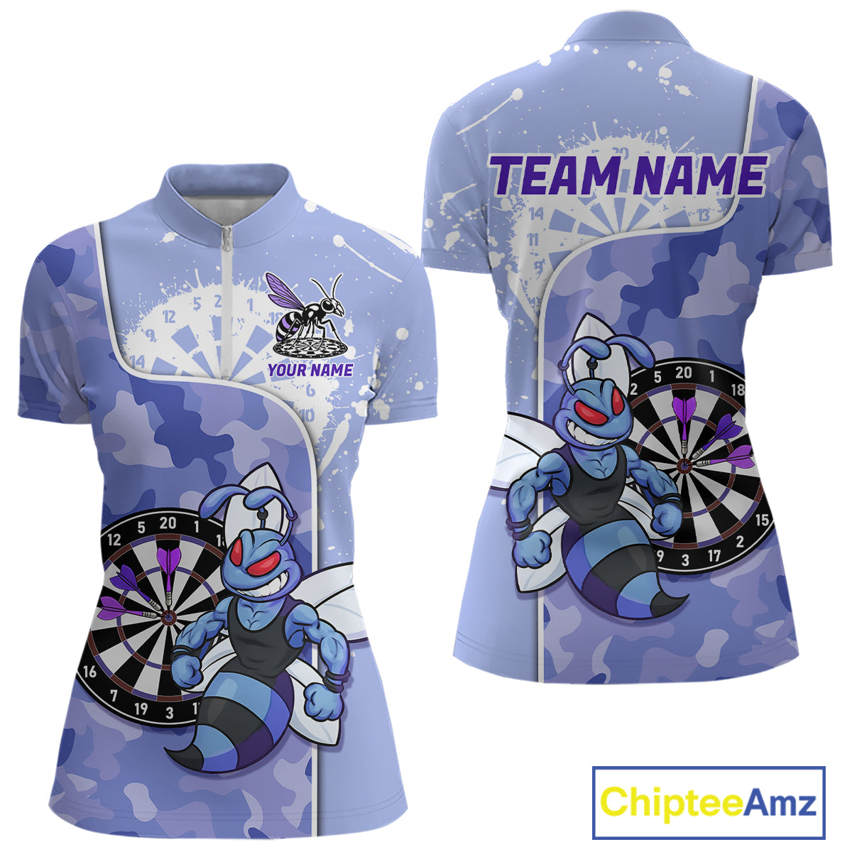 Custom Funny Bee Purple Camouflage Women Darts Quarter-Zip League Shirts Splatter Dart Jerseys NYN2210