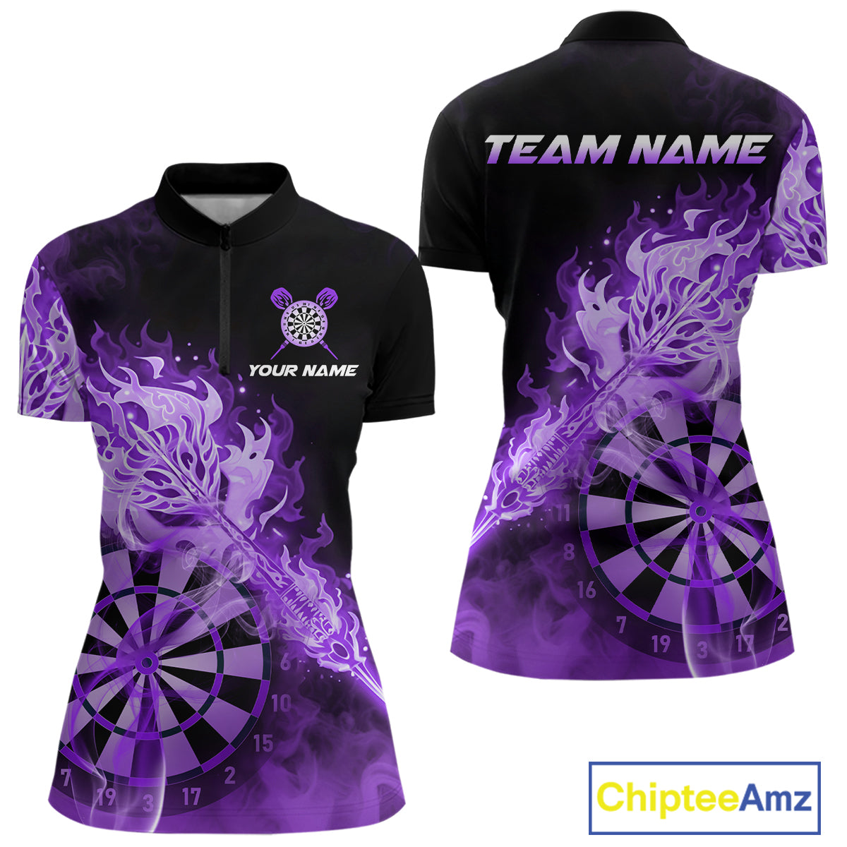 Custom Smoke Purple Fire Flaming Dart Arrow Women Darts Quarter-Zip League Shirts Dart Team Jerseys NYN2214
