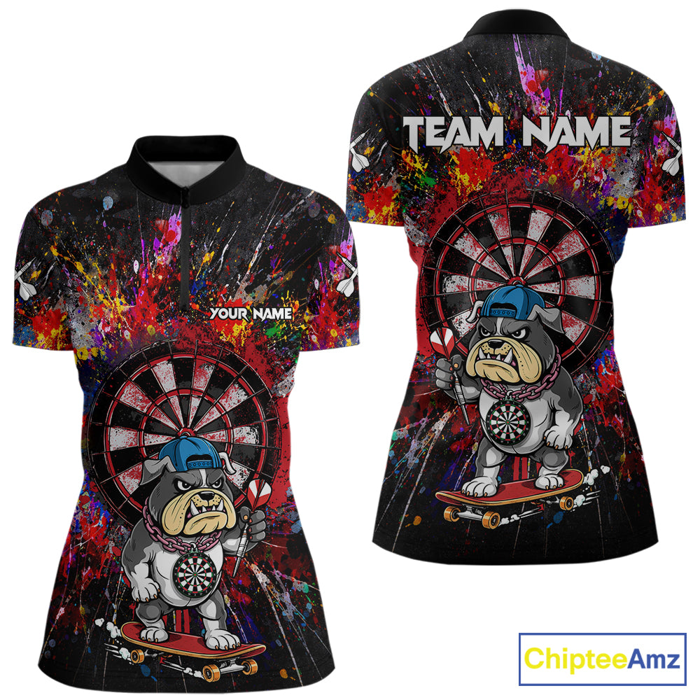Multi-Color Splatter Funny Bulldog Custom Women Darts Quarter-Zip League Shirts Dart Team Jerseys NYN2255