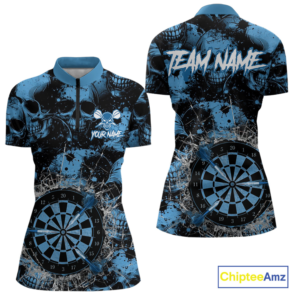 Blue Grunge Skull Cracked Glass Dartboard Custom Women Darts Quarter-Zip Shirts Dart Team Jerseys NYN2258