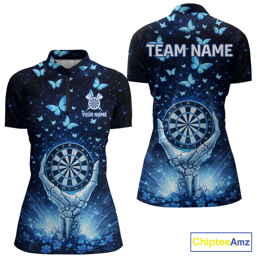Blue Light Butterflies Skull Dartboard Custom Women Darts Quarter-Zip Shirts Dart League Jerseys NYN2263