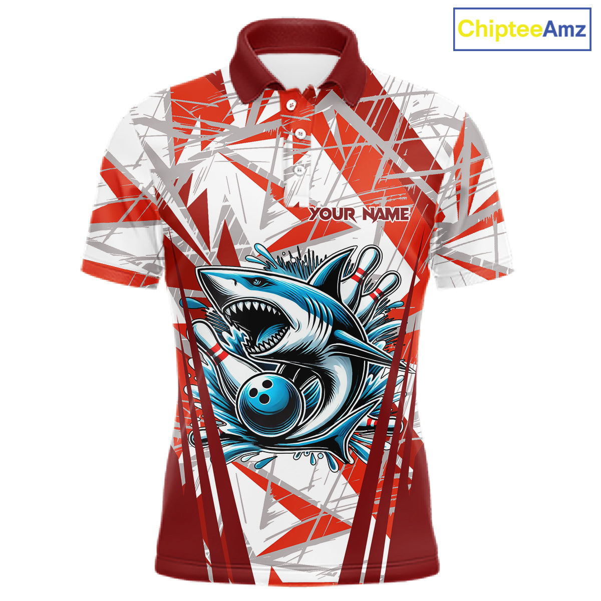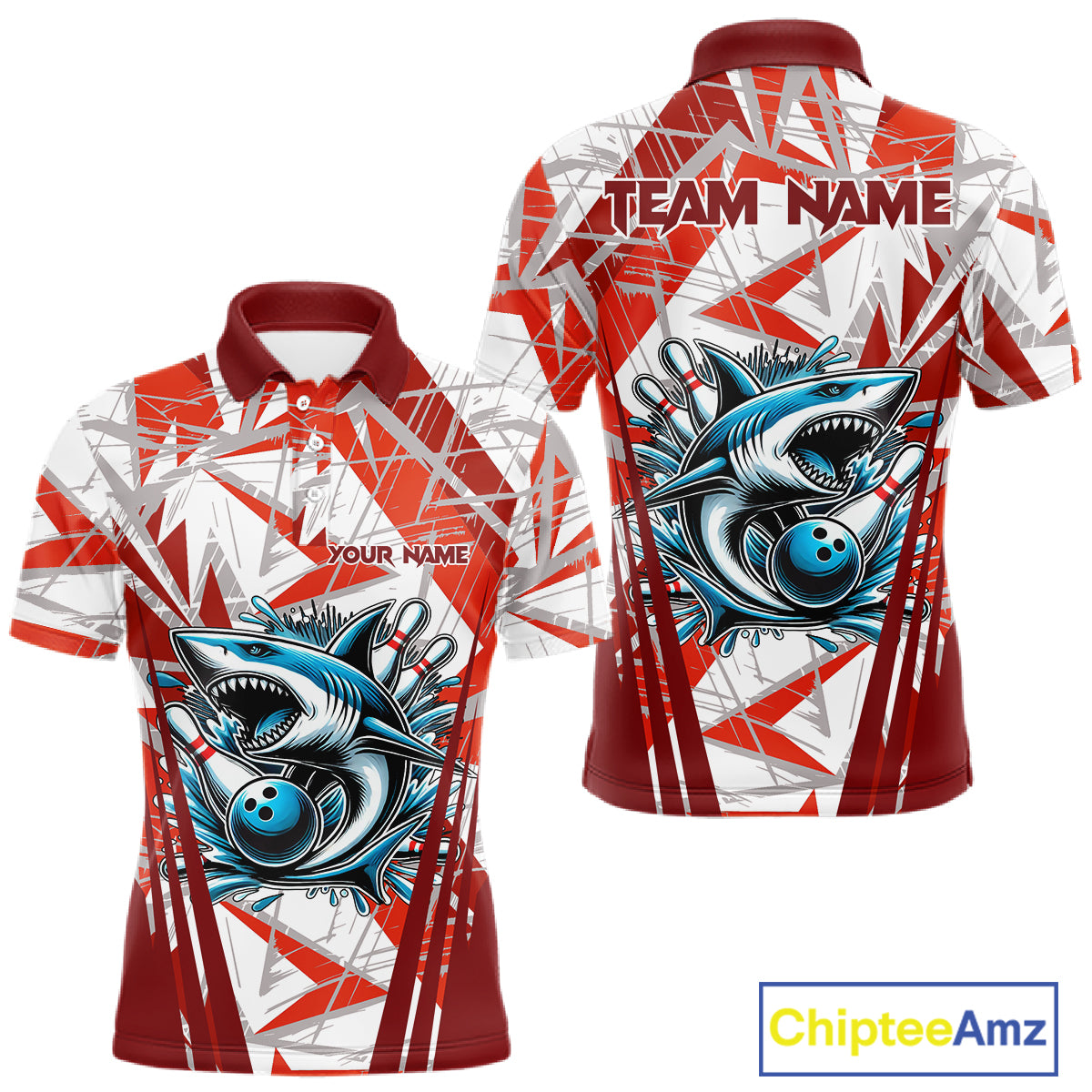 Red and White Camo Shark Bowling Team Shirts For Men Custom Shark Bowling Polo, Quarter Zip Shirt NQS11472