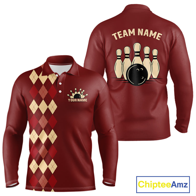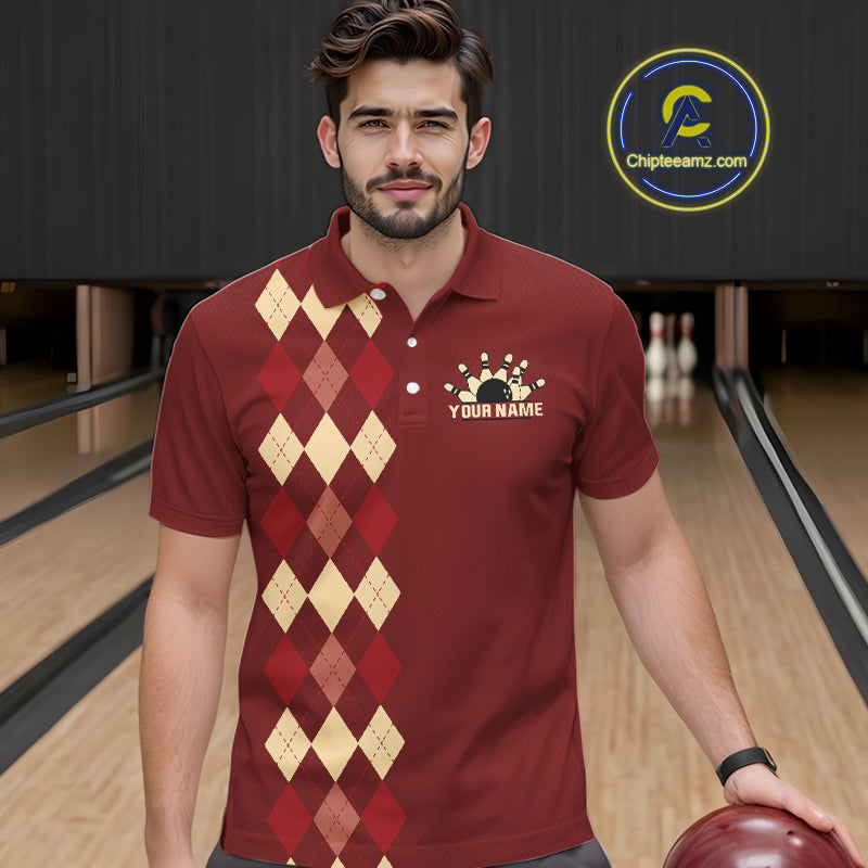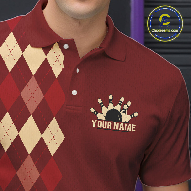 Red argyle pattern Bowling polo, 1/4 zip shirt for Men custom vintage bowling shirt, gift for bowlers NQS10255
